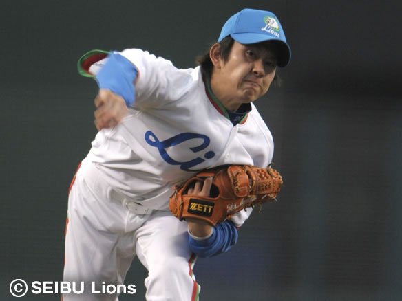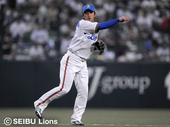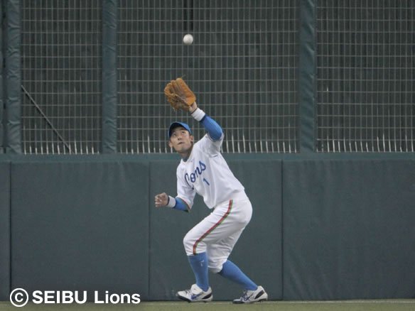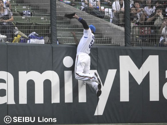 6番 G.G.佐藤 中飛 初球のストレートを果敢に打ちにいったが打ち上げてしまい、前進してきたセンター・サブローにおさえられた。 |