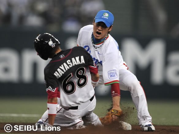 1番 西岡 二併 フルカウントからのストレートを引っ張られたが、打球はセカンド・片岡が正面でおさえ、素早く2塁へ送球。さらに2塁ベースカバーのショート・中島が1塁へ転送し、4-6-3のダブルプレー! |