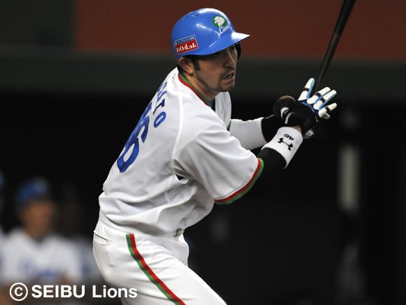 6番 G.G.佐藤 右安 2-1からアウトコースへのボールを逆らわずに弾き返し、鋭いライナー性の打球をライト・大松の前に運んだ! クリーンヒット! |