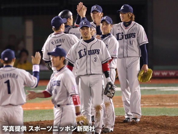 最終回も全く危なげのない投球で3者凡退。4対0で勝利してカード勝ち越しを決めました。 イーグルスの先発・田中の甘い球を見逃さず、G.G.佐藤、中島の一発攻勢などで効果的に得点を重ねた打線の援護を受けた帆足は9回を135球、被安打5、奪三振9、与四死球1で投げきる今季一番の快投を披露。勝ち星先行の6勝目を今季初完封で飾りました。 3位・イーグルスとのゲーム差を2に縮め、9月攻勢に弾みをつける勝利をあげたチームは意気揚々と明日から福岡で始まるホークスとの3連戦に乗り込みます!! |