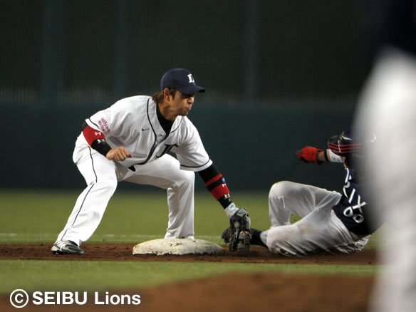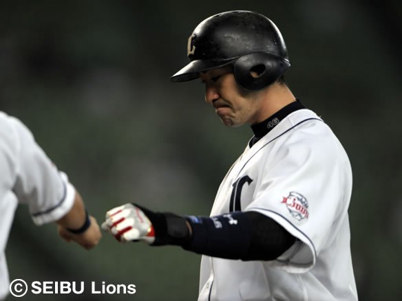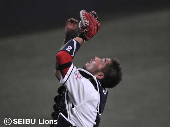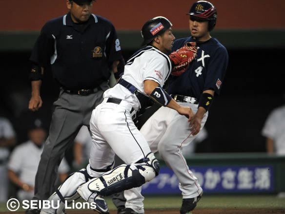 3番 カブレラ 右安 1-2から逆球となって高めに抜けたストレートを弾き返され、打球はライト前へ。2塁ランナー・阿部は3塁を蹴ったが、ライト・G.G.佐藤が素早く拾い上げて懸命のバックホーム! これをキャッチャー・銀仁朗がしっかりとおさえ、ホームベース手前で余裕のタッチアウト!! さらに送球間に2塁を狙ったカブレラを刺そうとしたが、こちらはセーフ。 |