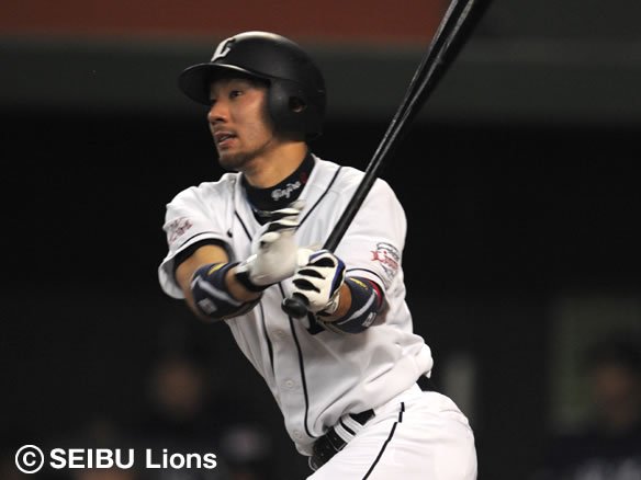 6番 G.G.佐藤 左安 1-2からアウトコースへのチェンジアップを引っ張り、打球はサード・フェルナンデスのグラブをかすめてしぶとく三遊間を破っていった! |