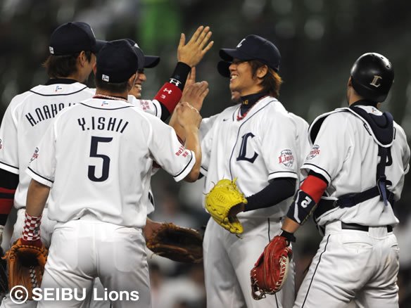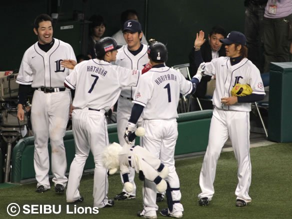 逆転劇の興奮冷めやまぬ中、2試合連続の完投勝利を目指して最終回のマウンドに上がった帆足、最後は自身の一番の武器であるパームボールで北川を三振に仕留め、試合終了!! 土壇場で飛び出した栗山の劇的な一発、そして帆足の自身初の無四球完投で、チームは勝率を5割に戻しました! これで4連勝となりましたが、まだまだ獅子の大反撃は続きます! 明日明後日も白星をつかんで連勝を伸ばし、上位チームを脅かしていきましょう!! |