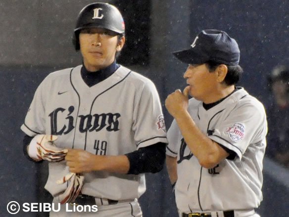 2死から大松に2ベースヒットを許して得点圏に進まれましたが、後続をキッチリ三振で仕留め、勝ち越しのホームを踏ませませんでした! これでライオンズに試合の流れは傾いたはず! 1番・片岡から始まる次の攻撃で、一気にマリーンズを突き放す!! |