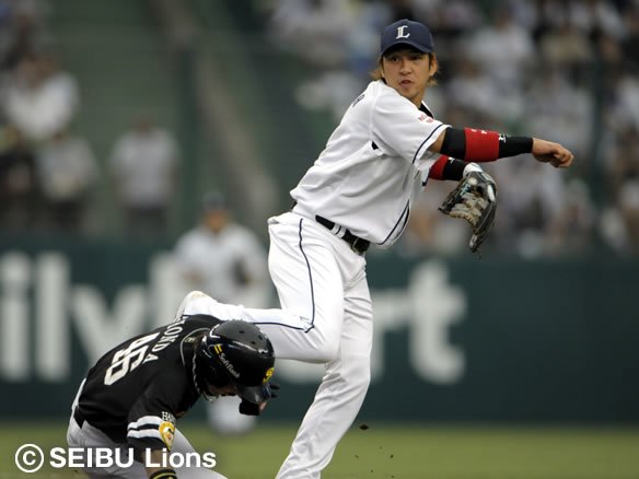 2番 川崎 二併 0-2からやや高めのストレートをたたかれたが、二遊間へ転がった打球をセカンド・片岡が正面でおさえ、素早く2塁ベースカバーのショート・中島へトス! 中島もすぐさま1塁へ送球し、鮮やかな4-6-3のダブルプレー! |