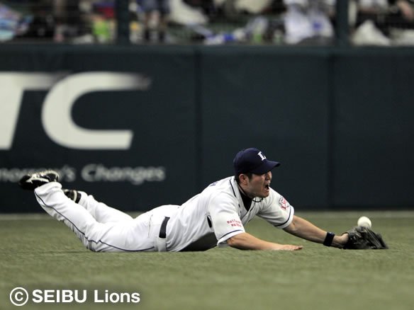 4番 小久保 レフトタイムリー2ベースヒット 2-2からインコースのストレートをたたかれ、打球は左中間方向へ。これをレフト・後藤が目測を誤り、すぐに前進してきてダイビングキャッチを試みたが、グラブに当てながらも捕球できず・・・。この間に2塁ランナー・川崎が3塁を蹴ってホームインし、1対3。小久保は2塁へ。記録は2ベースヒット。 ![]() 1