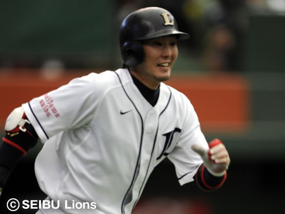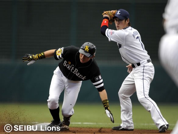 7番 佐藤 右翼安 初球を果敢に弾き返し、打球はファースト・小久保の頭上を越えてライト線際に転がっていった!! 3塁ランナー・中村に続き、2塁ランナー・石井義もホームへ滑り込み、7対1!! さらに1塁ランナー・G.G.佐藤は3塁へ! もはや誰も止められないライオンズ打線!! ![]() 7