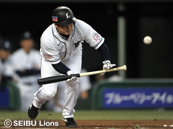 7番 佐藤 一犠 初球の高めのストレートをキッチリとボールの勢いを殺して1塁線際ギリギリのところに転がした! 前進してきたファースト・セギノールに処理させ、送りバント成功! 1塁ランナー・G.G.佐藤は2塁へ! |
