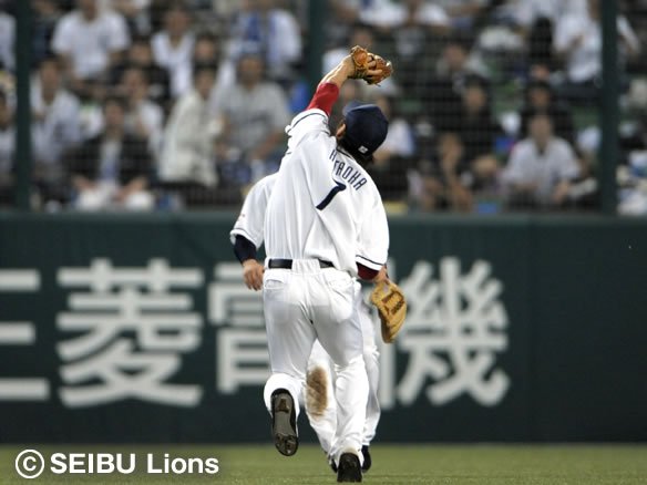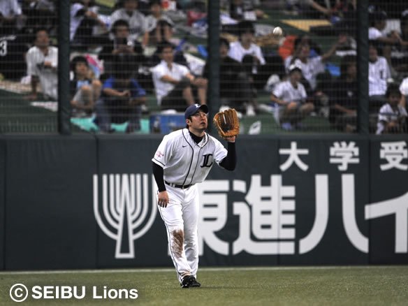 6番 G.G.佐藤 左飛 1-2からインコースのストレートを思い切りたたいたが詰まってしまい、左中間へ駆けていったレフト・中島にランニングキャッチでおさえられた。 |