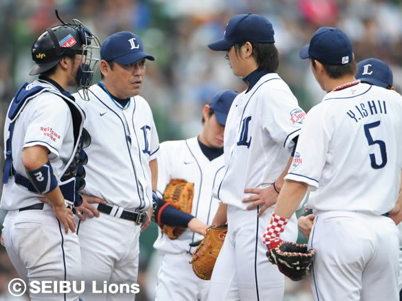 ここで早くも小野投手コーチがマウンドへ向かい、内野陣も集まって涌井のリズムを整えます。 |
