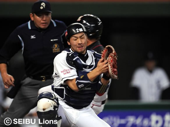 8番 炭谷 二安 2-1からの変化球を弾き返し、打球はピッチャー・小野のグラブをかすめて二遊間へ! これをセカンド・田中雅に正面へ回り込まれたが、田中雅は弾いてしまった。内野安打となったが、大崎が3塁を大きく飛び出しており、これをみた田中雅に3塁へ送球され、最後は三本塁間でタッチアウト・・・。 |