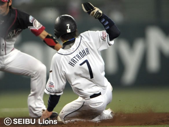 2番 栗山 四球 初球、1塁ランナー・片岡が勢いよくスタート!! キャッチャー・里崎に2塁へ送球されたが、これが2塁ベース手前でワンバウンドし、2塁ベースカバーのショート・西岡のタッチが遅れてセーフ! 片岡、これで見事2年連続50盗塁成功!! |