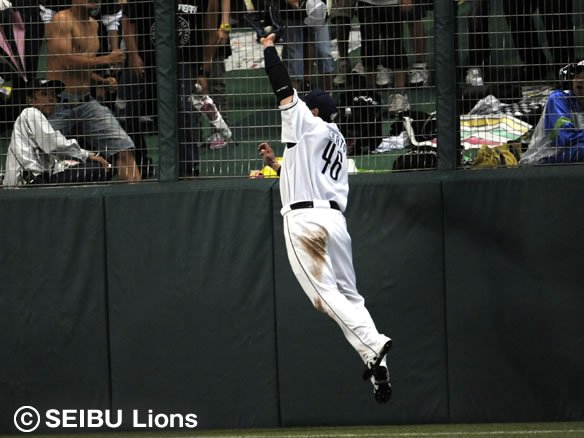 ライト・G.G.佐藤がフェンスにぶつかりながらもキャッチ!