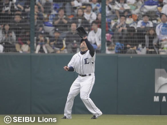 この試合初めて打球が外野に飛ぶもG.G.佐藤が落ち着いてキャッチ