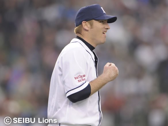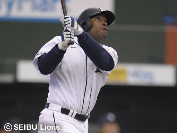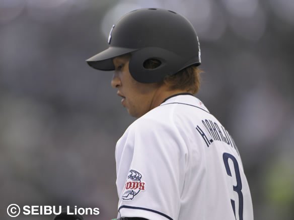 6番 G.G.佐藤 右飛 0-2からアウトコース高めのチェンジアップを打ち上げてしまい、高々と上がった打球はライト・サブローに悠々とキャッチされた。 |