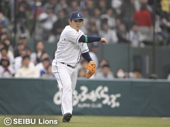 投手 涌井 5番 大松 左飛 2-2からアウトコース低めの変化球を打ち上げさせ、フラフラと上がった打球はレフト・G.G.佐藤が定位置でキャッチ! |