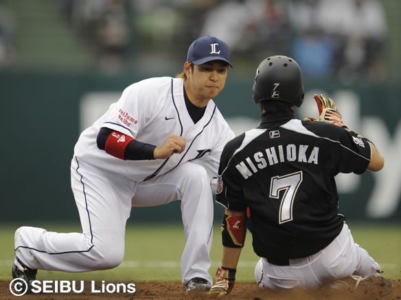 3番 中島 遊ゴ 2-1からアウトコースのシンカーを引っ掛けてしまい、ショート・西岡がキャッチして、2塁ベースカバーに入ったセカンド・井口に送球。1塁ランナー・栗山はフォースアウトになったが、栗山のスライディングで1塁への送球を防いだ! |