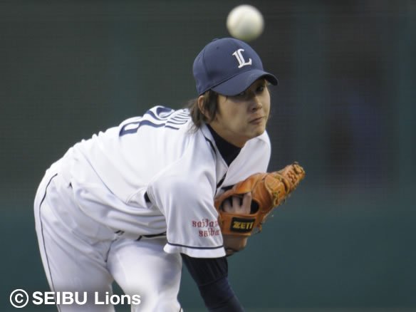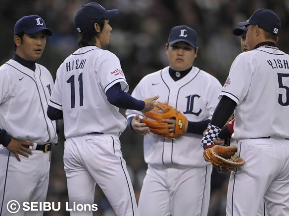 ライオンズOB・玉造陽二氏の始球式で始まったこの試合。1死から荻野貴にデッドボールを与えるも、後続をしっかりと打ち取って無失点に切り抜けました。岸を援護するべく早めに先制点を奪いたいところです! |