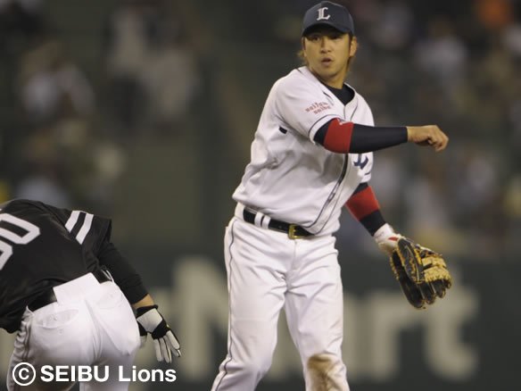 9番 田上 二併 1-1からアウトコース低めのストレートを打ち損じさせ、ボテボテの打球はセカンド・片岡の正面へ! 素早く2塁ベースカバーに入ったショート・中島に送球し、そのまま1塁へ送球! 4-6-3のダブルプレー! |