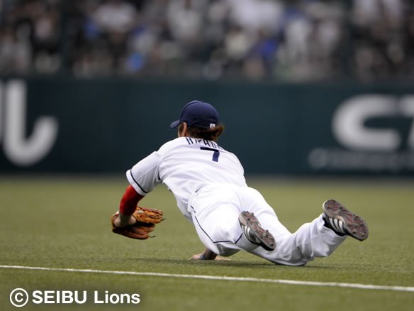 投手 西口 1番 聖澤 遊邪飛 0-1からアウトコース低めのストレートを打ち上げさせ、ショート・中島とサード・中村がボールを追いかけ、最後は中島がフィールドシート前でキャッチ! 中島のフェンスを恐れないナイスプレー! |