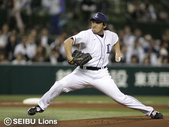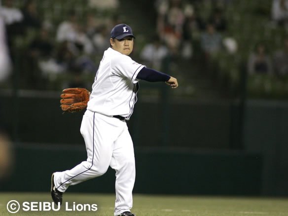 投手 石井一 投手 石井 8番 吉本 左飛 初球、アウトコース低めの球を引っ張られるも、強い打球はレフト・G.G.佐藤の守備範囲へ。 |