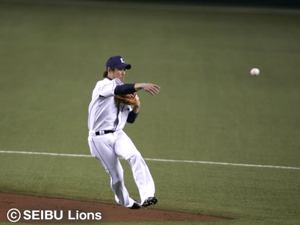 3番 中島 一邪飛 初球、インコース高めのストレートを打つも、打球は1塁側のファールゾーン中程へ。これをキャッチャー・相川とファースト・デントナが追うと、最後はデントナがキャッチ。 |