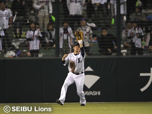 8番 G.G.佐藤 右飛 0-1から、アウトコース高めのストレートを弾き返すと、強い打球はライト・ガイエルの守備範囲へ。ガイエルがキャッチすると同時に2塁ランナー・高山はタッチアップで3塁へ進塁。 |