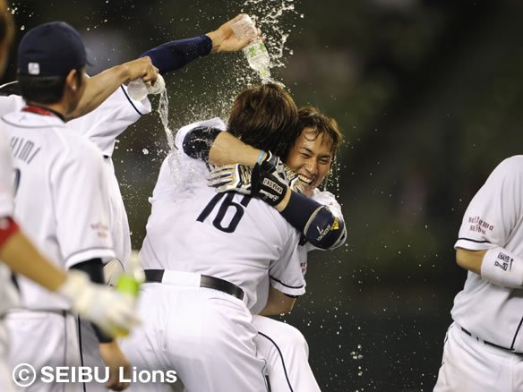劇的サヨナラタイムリーを放った片岡が水をかけられる!!