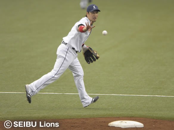 投手 帆足 1番 東出 二ゴ 1-1からアウトコース高めのパームボールを叩きつけ、大きくバウンドした打球をセカンド・片岡が前進しながら捕球し、素早く1塁へ送球! |