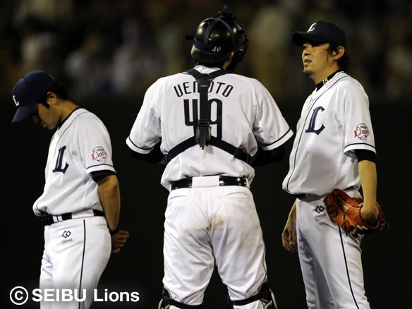 ここで潮崎投手コーチがマウンドに向かい、リズムを整えます。 |