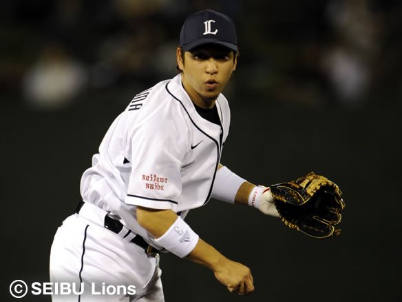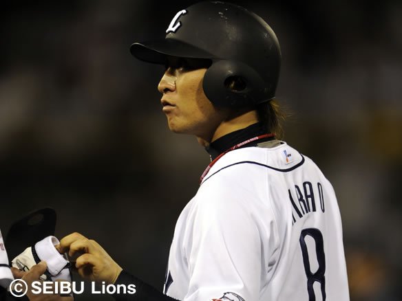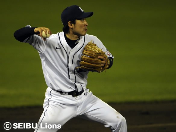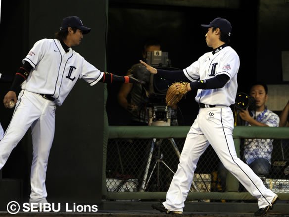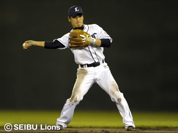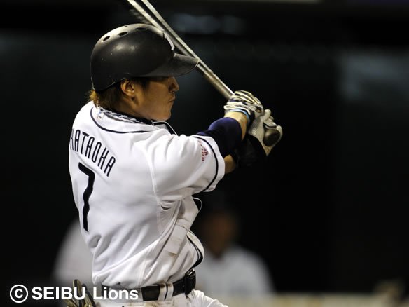 1番 田中賢 左安 2-0からの5球目、アウトコース高めの変化球をバットの先に合わされ、打球はレフト・G.G.佐藤の前へ落ちた。 |
