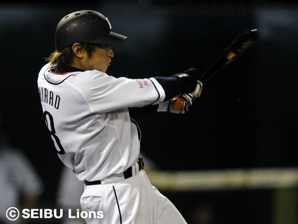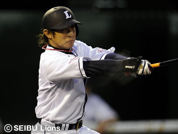 5番 G.G.佐藤 左安 0-1から真ん中高めの変化球を引っ張り、痛烈な打球をレフト・森本の前へ運んだ! |