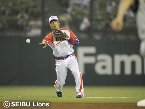 7番 陽 遊ゴ失 初球、アウトコースのストレートを振り抜かれ、バットを折りながらショート・中島が2塁ベース後方でキャッチし2塁に送球するも、これを2塁ベースカバーに入った片岡が捕球できず。片岡のエラーが記録された。 |