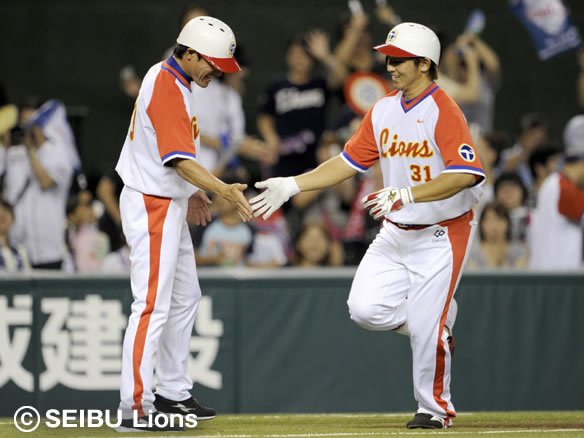 6番 フェルナンデス 右中二 1-1からアウトコース高めのスライダーを逆らわずに右中間方向に弾き返した! フェンスまで到達した打球を内野に中継してホームに送球され、クロスプレーとなったが、佐藤の足が先にホームを突き、5対0! 打ったフェルナンデスは2塁へ! ![]() 6
