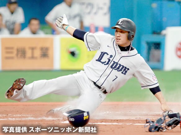 4番 カブレラ 右中三 1-1からアウトコース低めのストレートを弾き返された打球は、センター方向に飛びセンター・栗山が追いかけダイビングキャッチを試みたが一歩及ばず。ボールが転々とする間に打ったカブレラは2塁を蹴った。中継から3塁へボールが返ってきてクロスプレーとなるが判定はセーフ・・・。 |