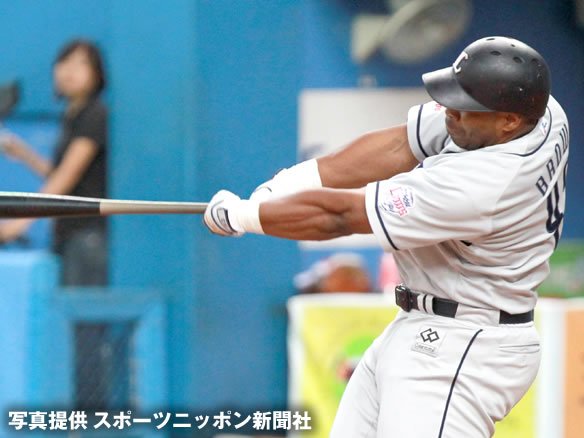 7番 ブラウン 一ゴ 初球、インコースのストレートをたたいた打球は、強い打球となってファースト・カブレラが1塁後方で捕球し2塁ベースカバーに入ったショート・山崎浩に送球。山崎浩は1塁に転送するが判定はセーフ。その間に2塁ランナー・フェルナンデスは3塁に進塁した! |