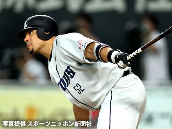 投手 武田勝 7番 佐藤 二ゴ 初球、アウトコースのストレートを弾き返すも、セカンド・田中賢に2塁ベース後方で補給され、素早く1塁に送られた・・・。 |
