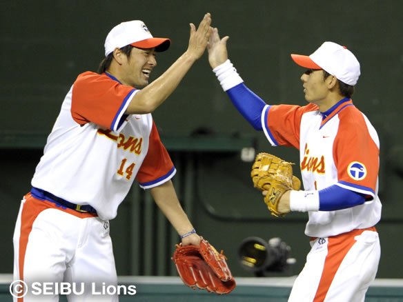 好投した小野寺とファインプレーを見せた栗山がハイタッチ!!