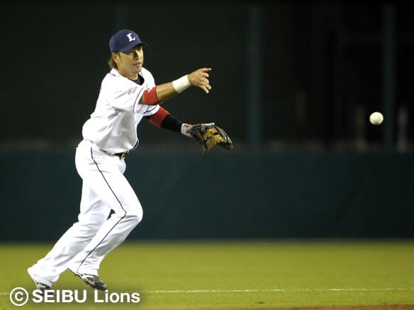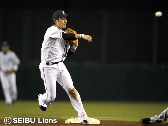 投手 石井 5番 陽 遊ゴ 2-0から3球目のスライダーで打ち取り、ショート・中島が2塁ベース付近でキャッチして、2塁カバーに入ったセカンド・片岡にトスして、フォースアウト! |