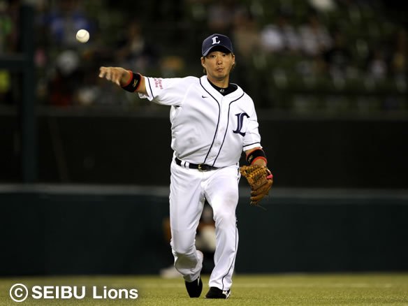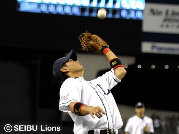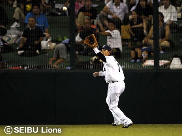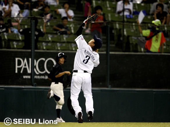 7番 佐藤賢 中飛 初球、真ん中のスライダーを弾き返されるも、センター・栗山がほぼ定位置でキャッチ! |