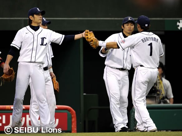 涌井は先頭の福浦にフォアボールを与えたものの、この回すべてのアウトに絡んだセンター・栗山の堅実な守備にも支えられて、無失点で切り抜けました! 中盤の展開でも攻撃の手を緩めず、マリーンズ投手陣に襲いかかりましょう! |