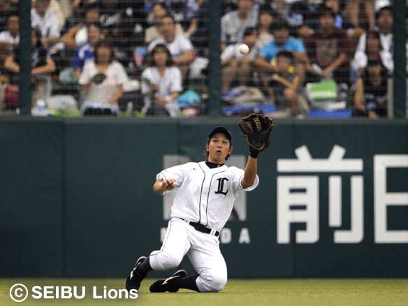 6番 金泰均 中飛 フルカウントからの6球目、アウトコースへのスライダーを打ち返されると、打球はセンターへ伸びた。センター・栗山が懸命にボールを追いかけ、最後はウォーニングゾーンで正面を向いて捕球! |