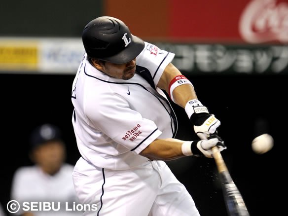 4番 フェルナンデス 左越安 初球、インコース低めへのカーブを思い切り引っ張ると、球足の速い打球がレフト・大松の横でバウンドしてフェンスまで到達! 1塁ランナー・中島は3塁へ進み、打ったフェルナンデスは打球の速さが災いして1塁ストップ。 |