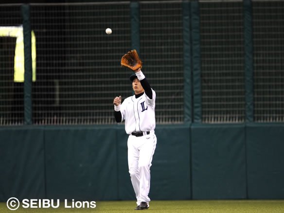 センター・栗山が悠々とフライをキャッチ