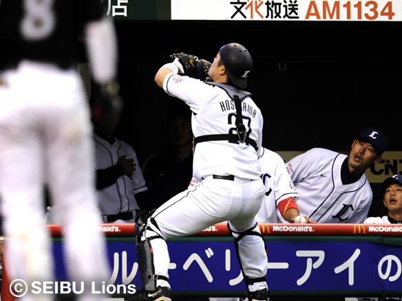 3塁ベンチ前でフライを捕球するキャッチャー・細川!