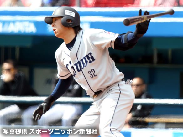 投手 唐川 2番 栗山 左安 1-1から真ん中高めの変化球を反対方向へ打ち返した打球はやや詰まるも、レフト前に落ちた! |