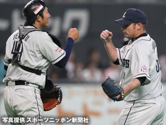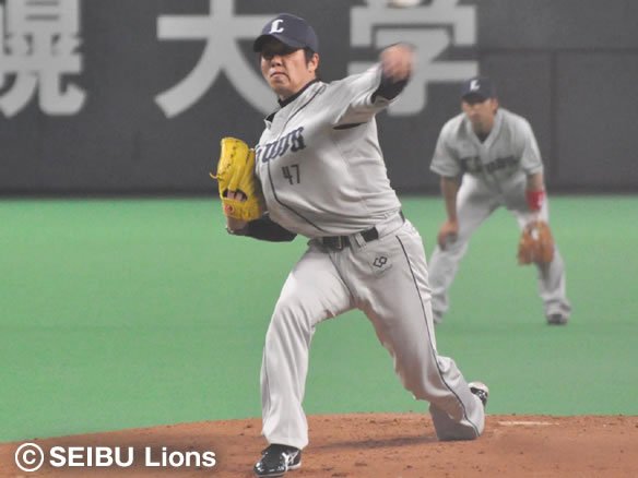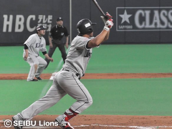 帆足は先頭の二岡にヒットを打たれましたが、その後ダブルプレーに仕留めるなど要所を締めるピッチングで相手打線をキッチリと封じます! 試合の流れは次第にライオンズに傾きつつあります。ラッキー7の攻撃で一気に勝ち越しといきましょう! |