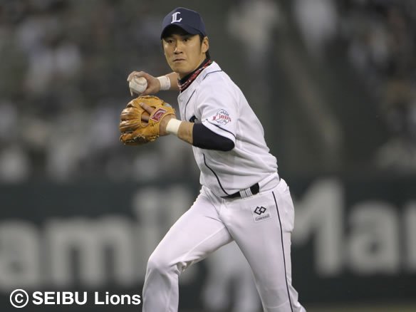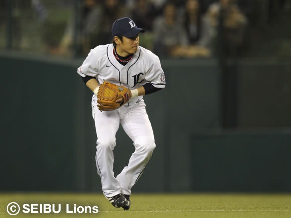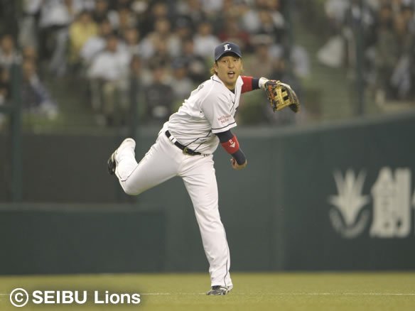 8番 里崎 遊ゴ フルカウントからの6球目、外角へのスライダーを打たれた打球は三遊間へ飛んだが、ショート・中島が逆シングルでショートバウンドする打球をキャッチ。そこから1塁へ素早いスローイングを披露! 流れるような守備でピンチを断った! |