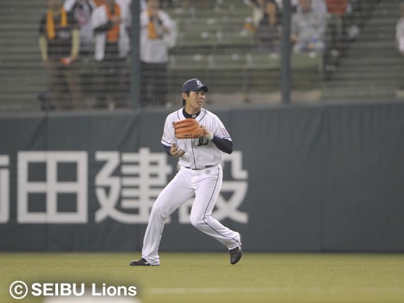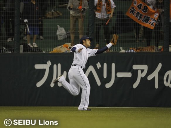 6番 矢野 中飛 1-1から外角高めへのストレートを打たれた打球は右中間へ伸びたが、必死に打球を追いかけるセンター・栗山がランニングキャッチ! |