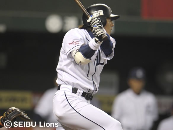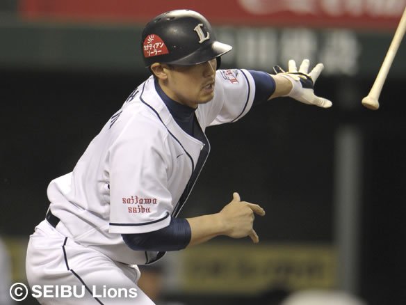 9番 秋山 左安 初球、外角高めへのストレートを流し打つと、打球はレフト線の近くに落ちた! これで2ケタ安打を早くも達成!! |